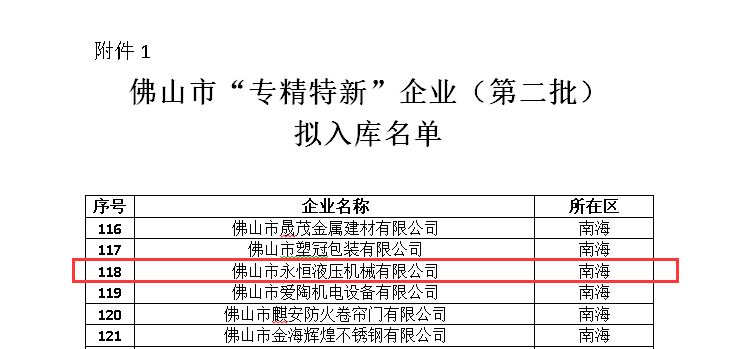 永恒液壓憑借廣闊的市場(chǎng)空間、產(chǎn)品用途的專門性、生產(chǎn)工藝的專業(yè)性及自主技術(shù)的專有性,成功入庫佛山市“專精特新”企業(yè)。